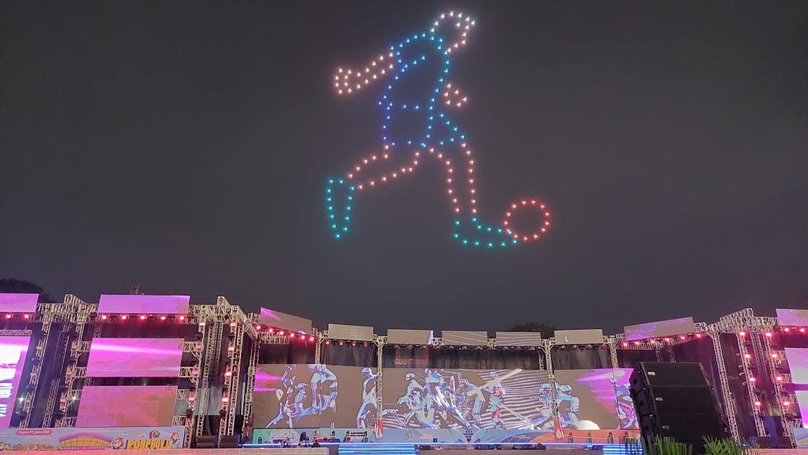 Dari pantauan di lokasi, drone dimainkan sekitar pukul 20.13 WIB seusai Gubernur Jawa Timur Khofifah Indar Parawansa, memberikan santunan anak yatim dan menyanyikan lagu Indonesia Raya.