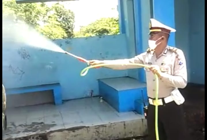 Polantas Polres Batu Semprot Terminal Batu Dengan Cairan Disinfektan