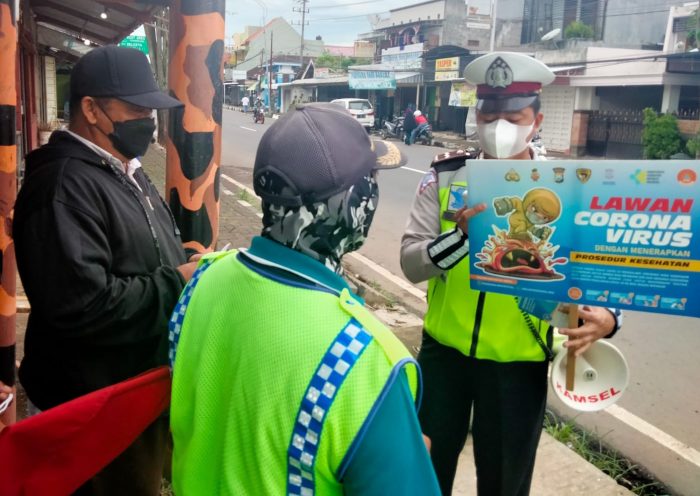 Dalam giat tersebut anggota Kamsel Satlantas Polres Malang mendatangi para tukang ojek yang biasa mangkal di kawasan pasar Karangploso dan di kawasan rest area sambil membagikan masker kepada mereka yang kedapatan tidak memakai masker.