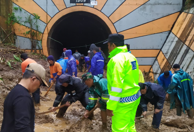 Material tanah bercampur lumpur menutupi hampir sebagian mulut Terowongan Karangkates II dan menutup akses jalur kereta pada Kilometer 84 antara Stasiun Sumberpucung Kabupaten Malang dan Stasiun Poh Gajih Kabupaten Blitar.
