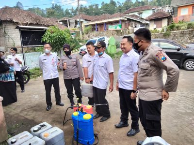 SEMPROT: Anggota Polsek Batu bersama instansi terkait saat melaksanakan persiapan penyemprotan disinfektan kepada hewan ternak sapi.