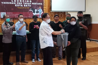 “Penyerahan vaksin dari Asisten 2 Pemkot Batu diberikan kepada drh. Utami Kurniawati bertempat di Kandang Komunal Kelompok Tani Gunung Harta di Desa Tulungrejo Kecamatan Bumiaji Kota Batu,” terang Anton.
