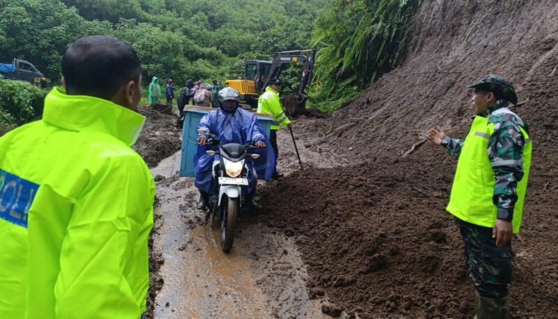 Longsor terjadi setelah hujan deras mengguyur kawasan tersebut sejak dini hari, mengakibatkan material tanah dan pohon tumbang menutup jalan dengan ketinggian mencapai 13 meter dan ketebalan 3 meter.