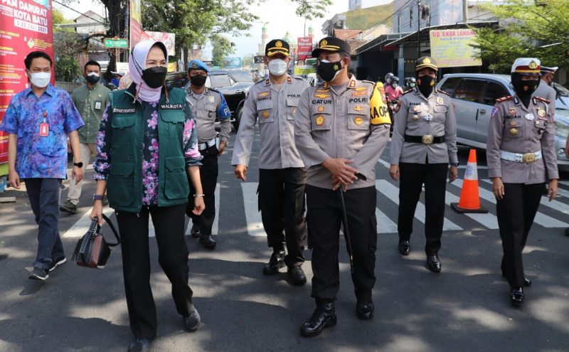 KUNJUNGI: Kapolres Batu AKBP Catur bersama Walikota Batu Dewanti saat melaksanakan kunjungan ke Pos Penyekatan PPKM Darurat Pendem.