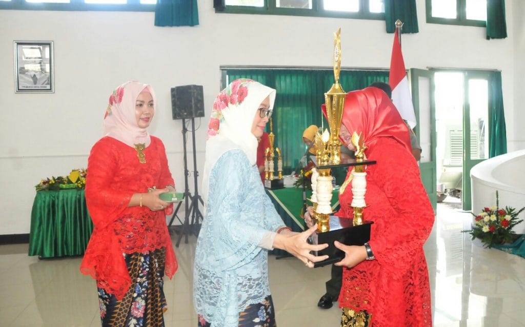 PEMENANG :Ketua Persit Korcabrem 083 Ny. Anne Bagus Suryadi Tayo saat menyerahkan piala kepada pemenang lomba busana tradisional
