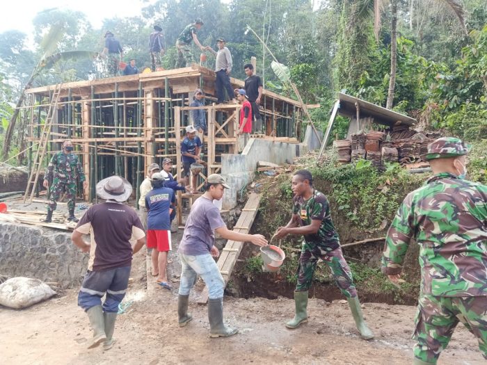 Malang, Memox.co.id – Satgas TMMD ke-112 Kodim 0818/Malang-Batu bersama masyarakat Tulungrejo bergotong royong mulai melakukan pengecoran atap Mushola Al-Ikhlas, Kamis (23/09/2021).