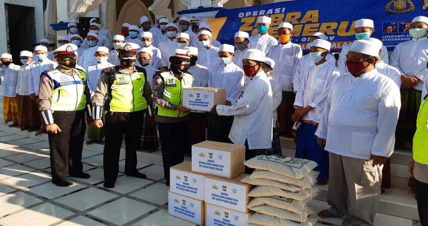 Kedatangan anggota Satlantas Polres Malang disambut para santri dengan penuh rasa persaudaraan sambil membagikan paket sembako termasuk beras yang tentunya sangat dibutuhkan pihak Ponpes di tengah Pandemi Covid-19.