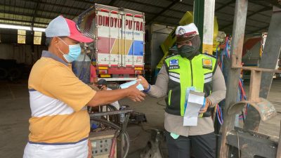 MASKER: Anggota Kamsel Satlantas Polres Malang saat membagikan masker kepada para sopir.