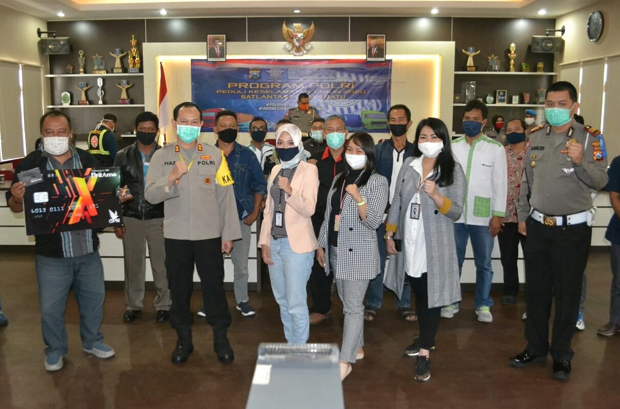 Dalam giat tersebut secara simbolis pimpinan cabang Bank BRI Kota Batu Tiara memberikan kartu Brizzi ke perwakilan sopir didampingi Kapolres Batu AKBP Harviadhi Agung P S.I.K.MIK dan Kasat Lantas AKP Mala Darlius Nanda Kurniawan SH,M.hum.