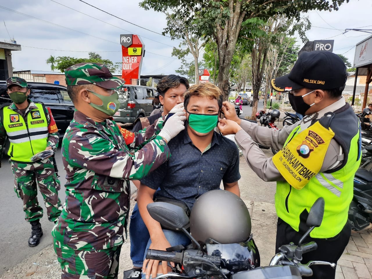 Danramil Dau Kapten Caj Bambang mengatakan, kegiatan pembagian masker tersebut merupakan bentuk kepedulian 3 Pilar Dau karena melihat masih banyak warga atau masyarakat yang belum sadar akan pentingnya memakai masker di tempat kerumunan umum saat pandemi Covid-19 ini.