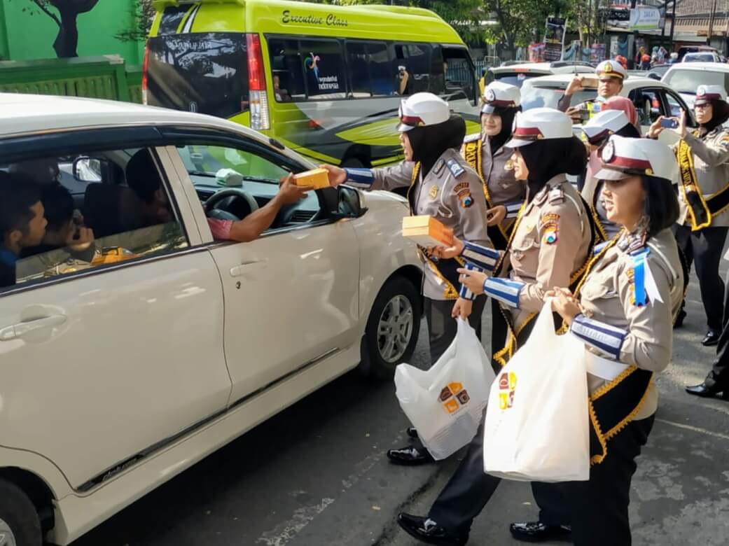 Dengan berseragam seorang Polwan puluhan anggota Polwan Satlantas Polres Malang Kota dengan penuh humanis menyampa pengendara sambil membagi Snack untuk bekal diperjalanan.