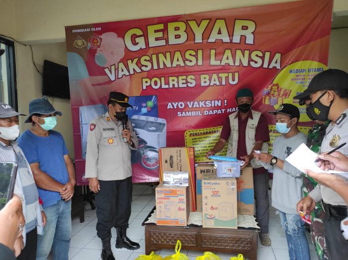 Bermacam-macam doorprize dibagikan Polres Batu, beberapa diantaranya adalah magic com, kipas angin, setrika, dan lompor gas. Pada kesempatan itu juga petugas menyampaikan kepada masyarakat khususnya lansia yang belum melakukan vaksin segera mendaftarkan diri untuk divaksin. (fik)