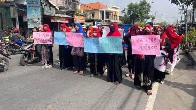 Ratusan warga Ngelom, Kecamatan Taman, Sidoarjo menggelar aksi turun ke jalan, Kamis (17/11/2022). Mereka menuntut penutupan Pasar Unggas dan Pemotongan di Pasar Sepanjang, Kecamatan Taman, Sidoarjo.