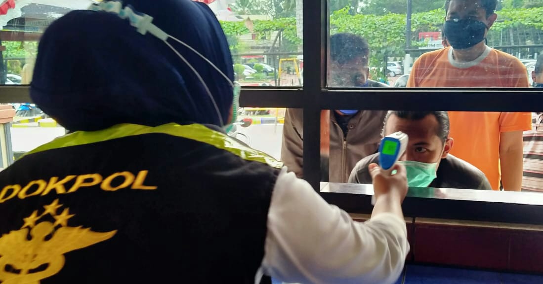 Malang, Memox.co.id – Guna mengantisipasi penyebaran virus Covid-19 di lingkungan Mapolres Malang, tim medis Covid-19 Dokpol Polres Malang secara ketat melaksanakan pemeriksaan suhu tubuh masyarakat yang ingin masuk ke Mapolres Malang, Rabu(22/07/2020).