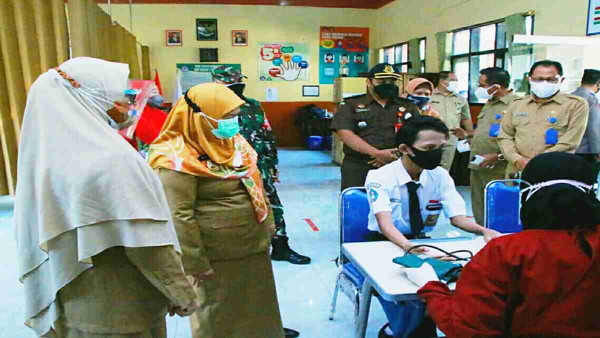 Situbondo, Memox.co.id – Pemberian suntikan vaksinasi Covid-19 kepada pelajar terus digencarkan sebagai upaya pencegahan penyebaran Covid-19, salah satunya di SMPN 1 Situbondo yang dilaksanakan di aula sekolah, Selasa (10//8/2021).