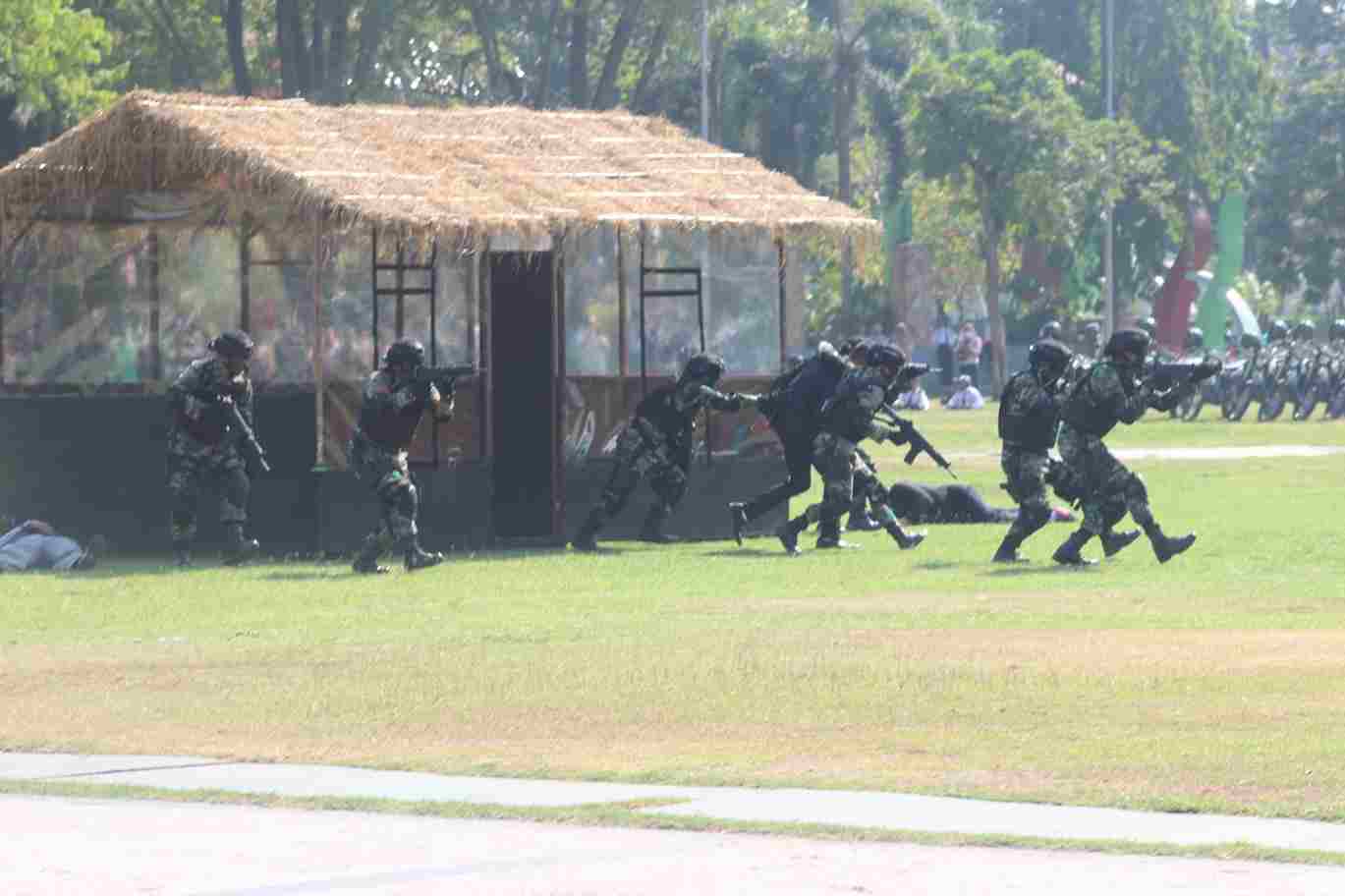 Peragaan demonstrasi ketangkasan prajurit TNI yang mendapatkan atensi dari peserta upacara di antaranya demonstrasi Bela Diri Militer (BDM), Pertempuran Jarak Dekat (PJD), dan snapling.