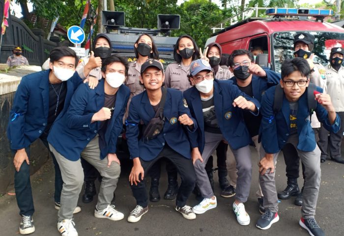 Selama melaksanakan aksinya, terlihat sejumlah anggota kepolisian Polresta Malang Kota bersama anggota TNI dan Brimob melaksanakan pengawalan secara humanis. Terlihat, para mahasiswa peserta unjuk rasa sempat berfoto ria bersama dengan anggota kepolisian.