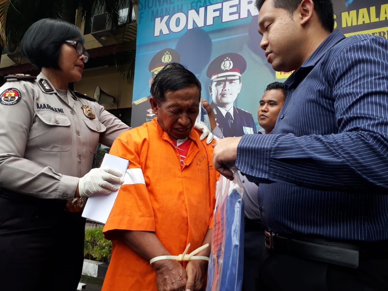 Tersangka kasus dugaan pencabulan IM (58), PNS guru olah raga SDN Kauman 3 Kota Malang, warga Jl Ade Irma Suryani, Kecamatan Klojen, Kota Malang, Rabu (27/3/2019) siang, dirilis di Polres Malang Kota. Pria yang sudah menduda selama 15 tahun ini awalnya terlihat tenang. Namun saat beberapa kamera terus mengambil gambar, di akhir rilis IM terlihat mewek.